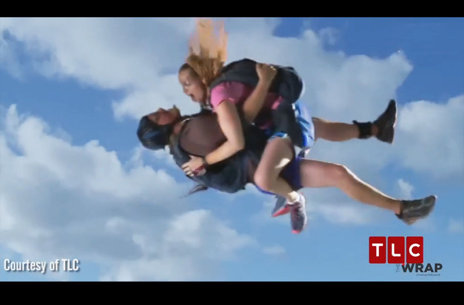 近日,美国旅游生活频道(TLC)实境秀节目《性爱让我挂急诊》最新一季预告片播出,预告片中,女嘉宾与男朋友大玩高空跳伞,在她与男朋友激情拥抱时,让她忘了在限高内打开降落伞,后来还是男朋友紧急回过神,硬是把她向上推开,让她重回安全高度,得以顺利开伞。但男朋友可并没有这么幸运,他被反作用力推得更接近地面的距离,当他开伞时,已不足以缓冲下坠速度,令他狠狠的摔向地面,最后果真让他“挂急诊”。图为女嘉宾与男朋友体验高空跳伞。(图片来自视频截图)