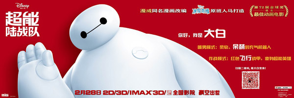 《超能陆战队》将于2月28日以2D、3D、IMAX3D以及中国巨幕在中国内地全线上映,值得关注。