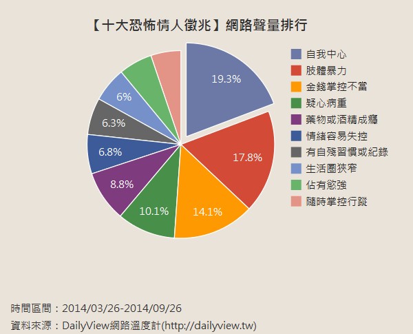 恋爱能让人沉浸于甜蜜幸福,好比上天堂,分手时的痛苦却又能使人痛不欲生,瞬间跌落地狱,若情绪调适不当,或本身就持有错误的爱情观,很容易酿成悲剧,伤害自己或伤害曾经深爱过的情人,更甚者还可能波及另一半的亲友。,DailyView网络温度计搜罗网络大数据,分析出10大恐怖情人征兆,各位恋爱中或是向往恋爱的网友们,请睁大眼睛看仔细啦!