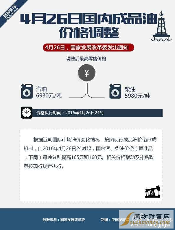 4月26日,国家发改委下发通知,自2016年4月26日24时起,将国内汽、柴油价格(标准品,下同)每吨分别提高165元和160元。这是自“六连跌”后年内首次上涨,同时也是三个月以来调价机制的首次启动。