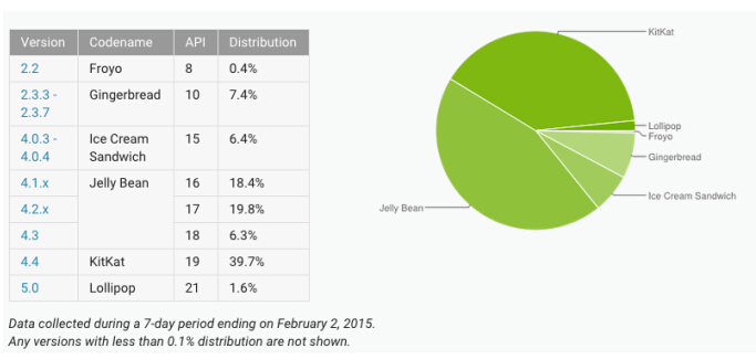 凤凰科技讯 北京时间2月3日消息,据科技博客TechCrunch报道,谷歌最新公布的Android系统份额官方数据显示,在Android 5.0——代号为“Lollipop”(棒棒糖)系统发布3个月后,在Android设备中的安装比例仍不足2%。